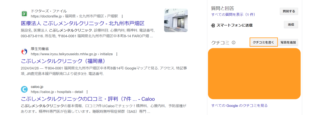 または、ビジネスプロフィールの「Googleのクチコミ(○○件)」をクリックするとレビューの一覧が表示されます。その右上の「クチコミを書く」ボタンをクリックすると、同じように投稿記入画面に進むことができます。