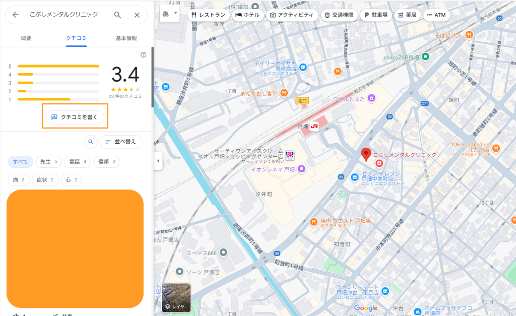 ビジネス情報が表示されたら、左側のパネルを下にスクロールし、「クチコミを書く」ボタンをクリックします。